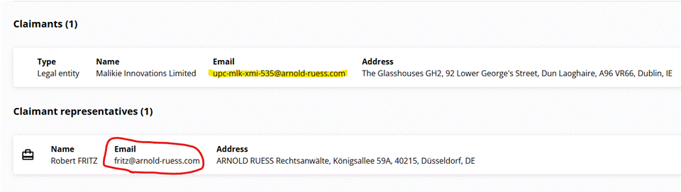 Unter der "Claimant representative"-E-Mail-Adresse (rot umkreist) unsere entsprechende Verteiler-E-Mail-Adresse (gelb markiert) angeben, damit sämtliche Benachrichtigungen an alle auf dem Verteiler gehen und nicht mehr nur an den einen angegebenen Anwalt. So können wir vermeiden, dass CMS-Nachrichten jeglicher Art untergehen.