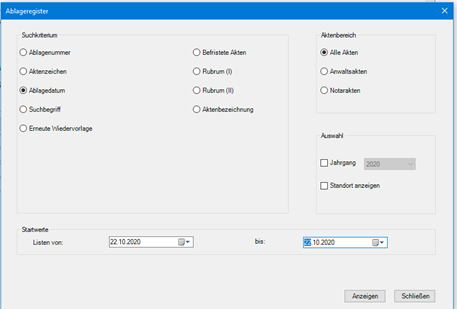 Start – Register – Ablageregister, hier am besten nach Ablagedatum suchen: