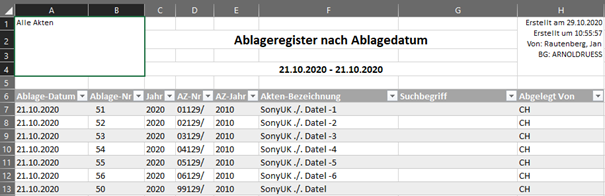 Jetzt wird in einem in Excel die Ablageübersicht mit Akten und zugehörigen Ablagenummern angezeigt: