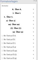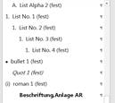 A. Überschrift (zentriert); FF: 08 I. Überschrift (zentriert); FF: 09 1. Überschrift; FF: 10 a) Überschrift; FF: 11 aa) Überschrift; FF: 12 (1) Überschrift; FF: 13 (a) Überschrift; FF: 14 1 Randnummern-Text zu Überschrift A.; FF: 08 2 Randnummern-Text zu Überschrift I.; FF: 09 3 Randnummern-Text zu Überschrift 1.; FF: 10 4 Randnummern-Text zu Überschrift a); FF: 11 5 Randnummern-Text zu Überschrift aa); FF: 12 6 Randnummern-Text zu Überschrift (1); FF: 13 7 Randnummern-Text zu Überschrift (a); FF: 14 Text ohne Randnummer zu Überschrift A.; FF: 15 Text ohne Randnummer zu Überschrift I.; FF: 16 Text ohne Randnummer zu Überschrift 1.; FF: 17 Text ohne Randnummer zu Überschrift a); FF: 18 Text ohne Randnummer zu Überschrift aa); FF: 19 Text ohne Randnummer zu Überschrift (1); FF: 20 Text ohne Randnummer zu Überschrift (a); FF: 21 I. Aufzählung Text I.; FF: 10 1. Aufzählung Text 1.; FF: 10 a) Aufzählung Text a); FF: 11 aa) Aufzählung Text aa); FF: 12 (1) Aufzählung Text (1); FF: 13 (a) Aufzählung Text (a); FF: 14 l bullet A.; FF: 28 l bullet I.; FF: 29 l bullet 1.; FF: 30 l bullet a); FF: 31 l bullet aa); FF: 32 l bullet (1); FF: 33 (i) roman A.; FF: 34 (i) roman I.; FF: 35 (i) roman 1.; FF: 36 (i) roman a); FF: 37 (i) roman aa); FF: 38 (i) roman (1); FF: 39 Quotation A.; FF: 40 Quotation I.; FF: 41 Quotation 1.; FF: 42 Quotation a); FF: 43 Quotation aa); FF: 44 Quotation (1); FF: 45 Quotation (a); FF: 46 A. List Alpha 2 (fest); FF: 47 1. List No. 1 (fest); FF: 48 1. List No. 2 (fest); FF: 49 1. List No. 3 (fest); FF: 50 1. List No. 4 (fest); FF: 51 l bullet 1 (fest); FF: 52 Quotation 1 (fest); FF: 53 (i) roman 1 (fest); FF: 54 Anlage AR 1; FF: 08 AR Standard (alt); FF: 56 1 AR Standard (Rn) alt; FF: 57 Überschrift (alt); FF: 56 AR Zitat (alt); FF: 59 Anlage zentriert (alt); FF: 56 |