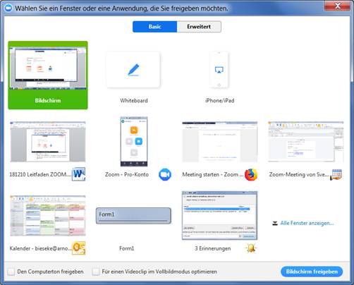 · Verschiedene Optionen für Bildschirm freigeben (Screensharing):