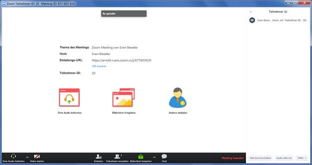 · Optional: Auf den Meeting-Link klicken, um Teilnehmerliste zu sehen und ggf. Screensharing zu machen. Dabei wird eine Teilnehmer-ID angezeigt, zur Zuordnung zwischen PC und Telefon