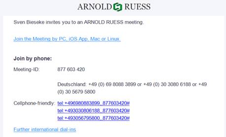 · Im oberen Bereich wird die erste Einwahlnummer inkl. Meeting-Nummer mit einem Hörersymbol dargestellt – einfach draufklicken und man wird automatisch eingewählt.