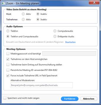 · Fortfahren > automatischer Termin mit Einwahldaten wird generiert